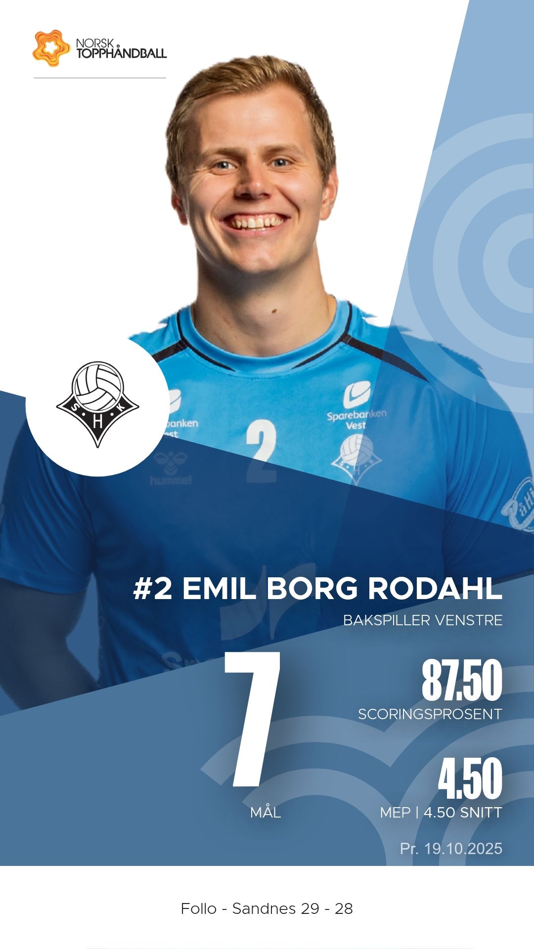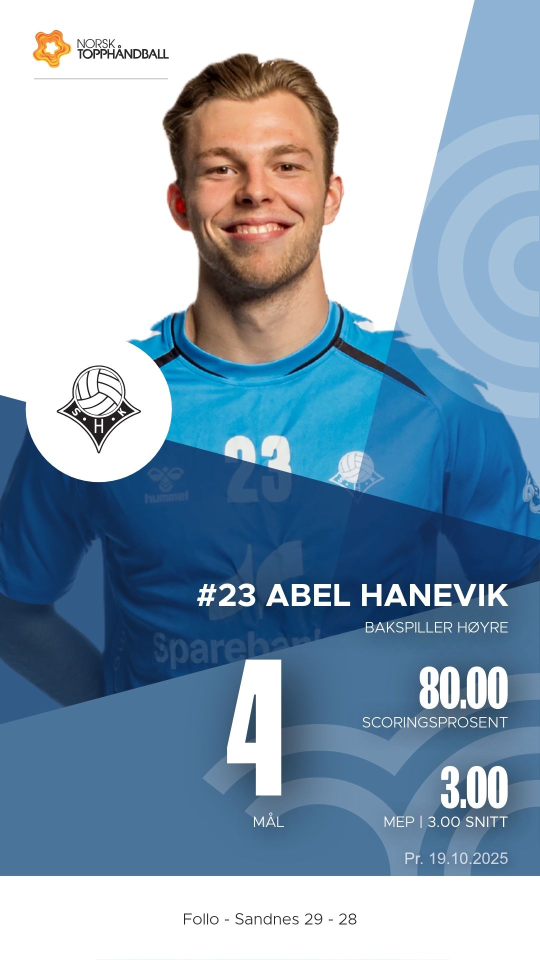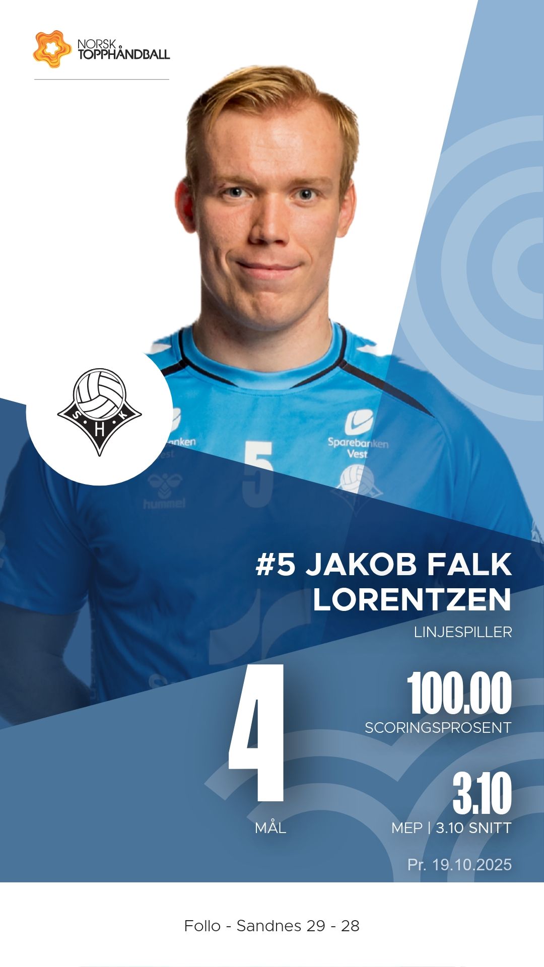 Follo tok imot Sandnes i Stil Arena søndag 19. oktober 2025 i REMA 1000-ligaen. Etter en intens og jevnspilt kamp endte det 29–28 til hjemmelaget, men Sandnes viste en kampmoral og et angrepsspill som lover godt for fortsettelsen.