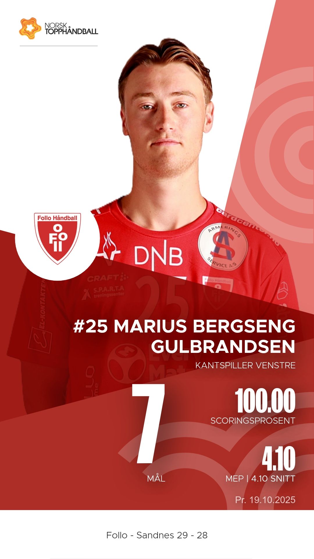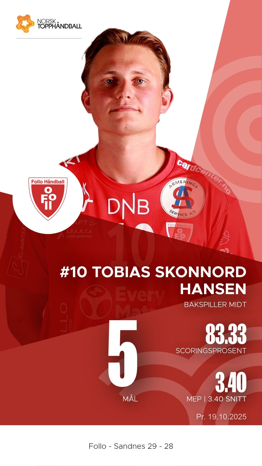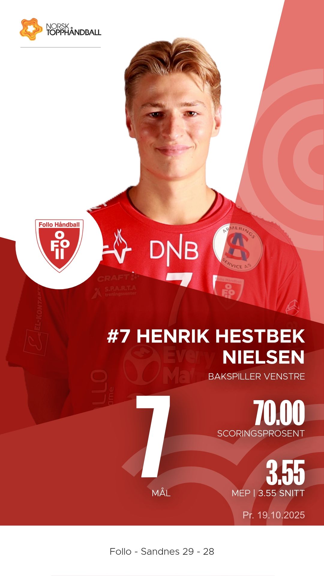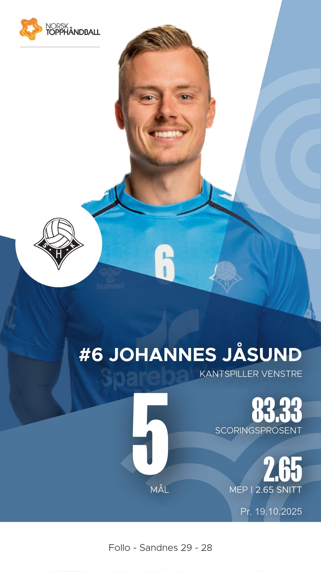 Follo tok imot Sandnes i Stil Arena søndag 19. oktober 2025 i REMA 1000-ligaen. Etter en intens og jevnspilt kamp endte det 29–28 til hjemmelaget, men Sandnes viste en kampmoral og et angrepsspill som lover godt for fortsettelsen.